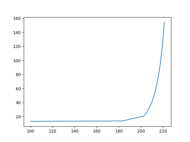 l1 = [100.00, 120.33, 140.21, 159.81, 179.25, 183.13, 202.49, 202.89, 204.18, 205.35, 206.44, 207.45, 208.40, 209.30, 210.15, 210.96, 211.73, 212.47, 213.18, 213.87, 214.53, 215.17, 215.79, 216.39, 216.98, 217.54, 218.10, 218.63, 219.16, 219.67, 220.18, 220.67, 221.15]