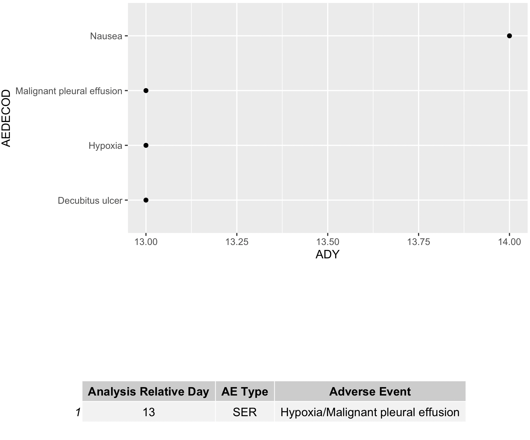 "Decubitus ulcer", "Nausea"), ADY = c(13, 13, 13, 14)), row.names = c(NA,