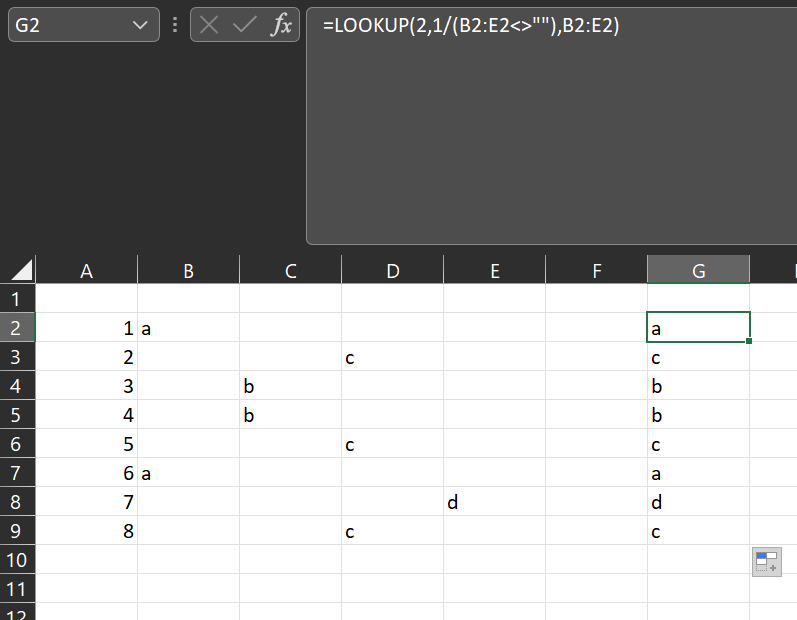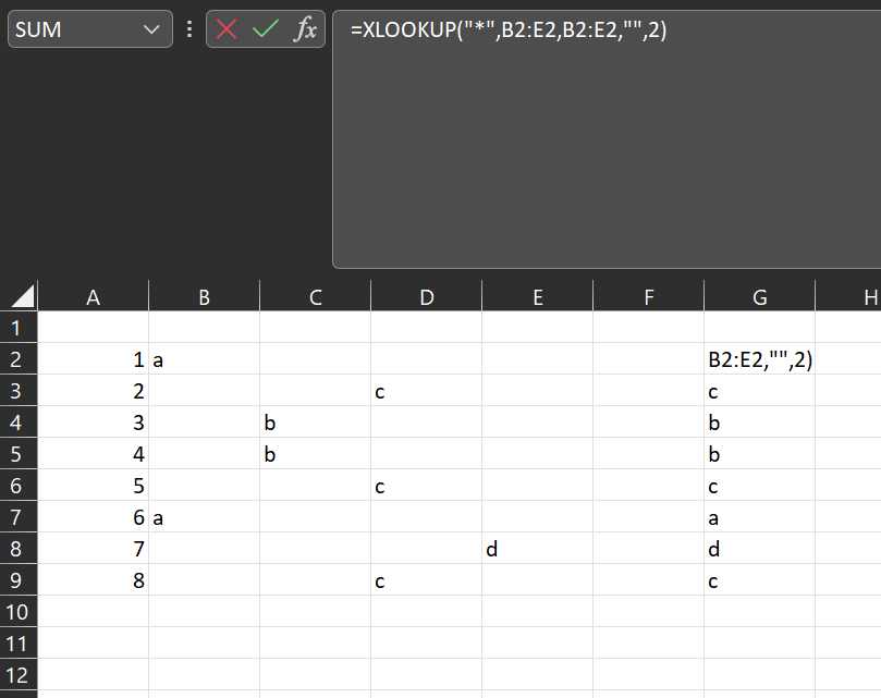 =XLOOKUP("*",B2:E2,B2:E2,"",2)