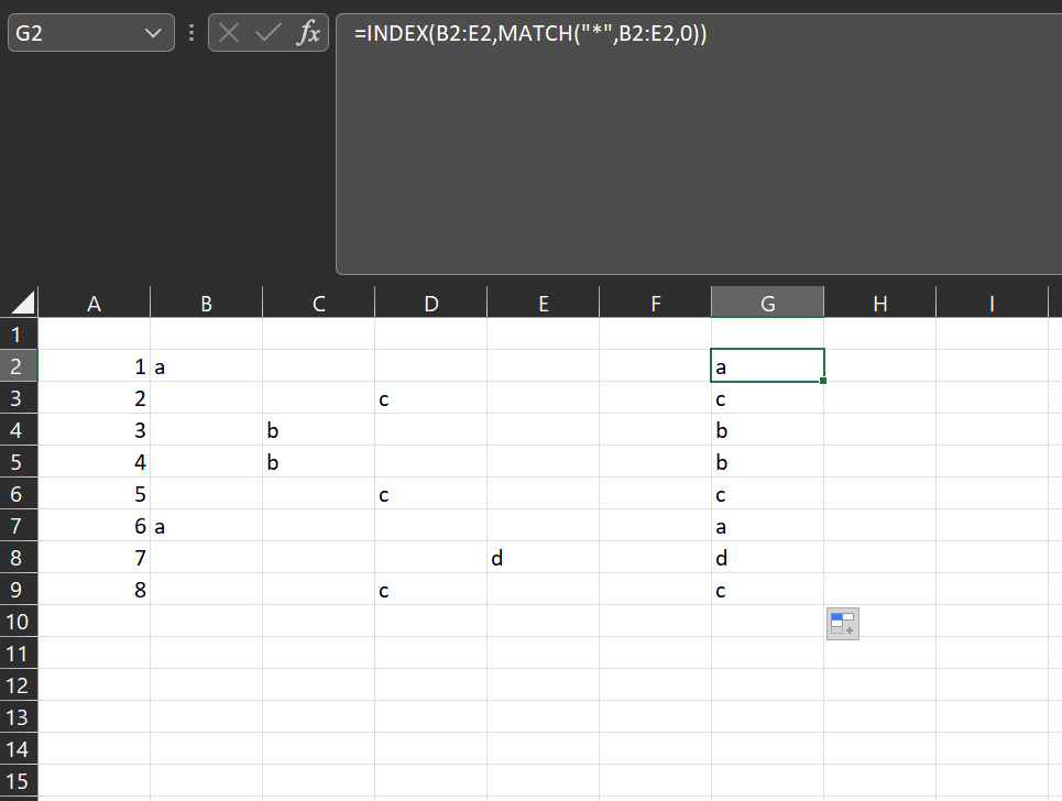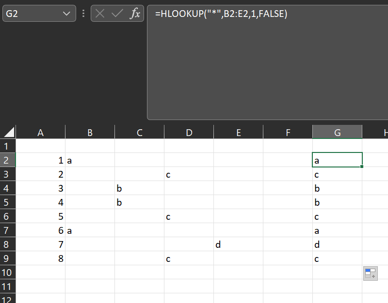 =HLOOKUP("*",B2:E2,1,FALSE)