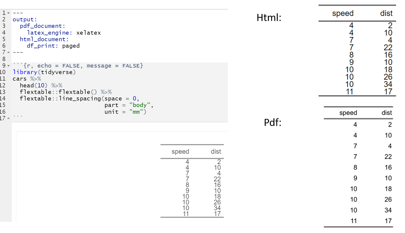 When knitting to html, flextable::line_spacing(space = 0) does what is expected, reducing the line spacing. When knitting to pdf, it does not. See code below and screenprint. I am using flextable version 0.7.3. Setting the height has a similar effect, besides some of my real data runs on more lines, so setting an exact row height is not oke. Since I have conditional formatting in my real data, flextable is easier than for instance kableExtra::column_spec(). Anyone an idea how to get the pdf produced with flextable with actual reduced line spacing? Thanks!