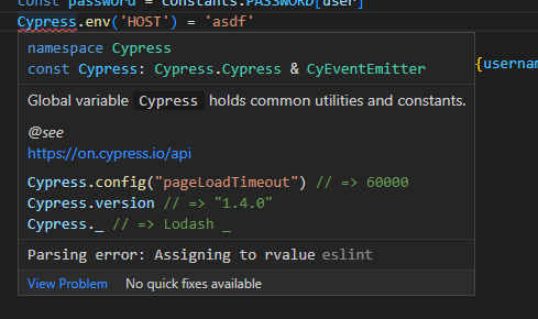 I was trying to do something like Cypress.env('myUsername') = 'testUser', but I get this lint error: