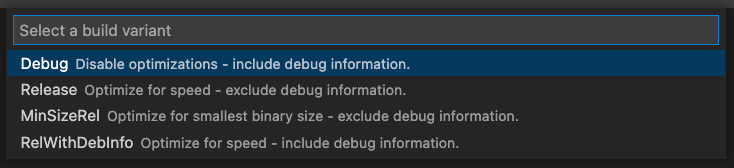 Anyway, if you click on the portion that says CMake: [Debug]: Ready a select-variant list should open near the top of the IDE in the location you’re probably familiar seeing the general Command Palette open. It will look like this: