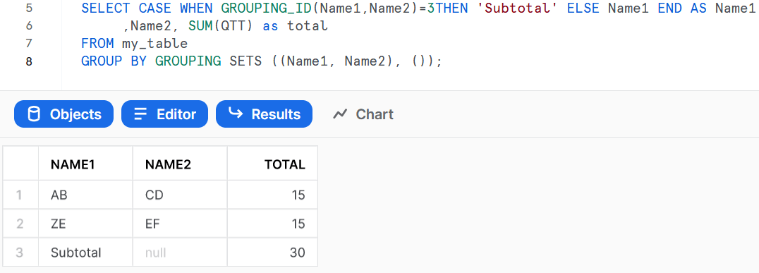 GROUP BY GROUPING SETS ((Name1, Name2), ());