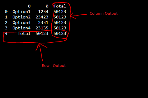 You will see that I am looking at a two-column dataframe with the "Options" column and then a numerical value. The end goal is to have a "Total" column at the end of the option 4 row this will need to be an aggregate of all the numbers in Options 1-4. Please let me know the best way to go about this! Thank you