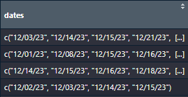 The rows are all variations of this: c("12/01/23", "12/02/23", "12/04/23", "12/05/23", "12/07/23", "12/13/23", "12/14/23", "12/15/23", "12/16/23", "12/17/23", "12/19/23", "12/20/23", "12/21/23", "12/22/23", "12/23/23", "12/24/23", "12/25/23", "12/30/23", "12/31/23")" which is just one long string that I am not able to use for much.