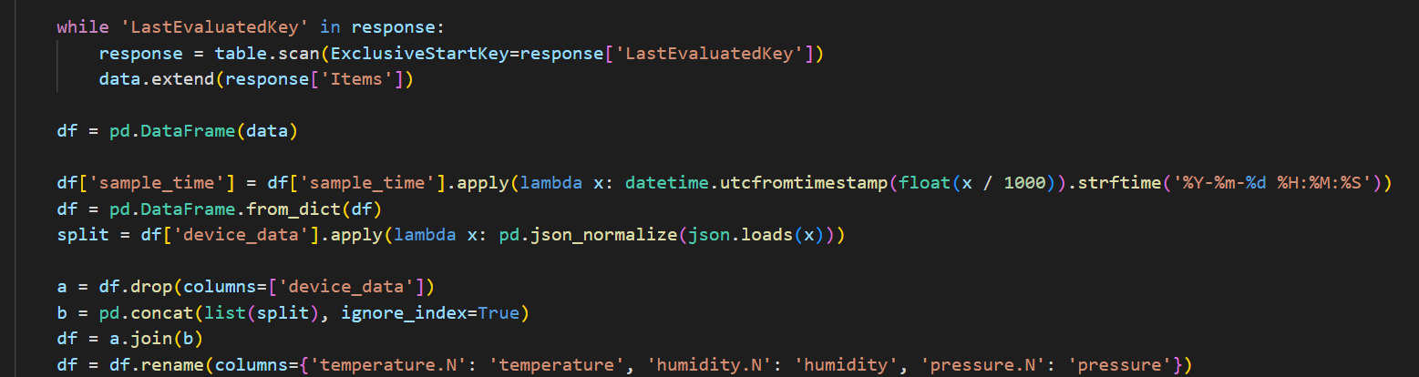 This is the code I am attempting to run. It works when I run a csv file but I am continuously streaming data from DyanmoDB and this code will not work and I receive the following error when attempting to do so.