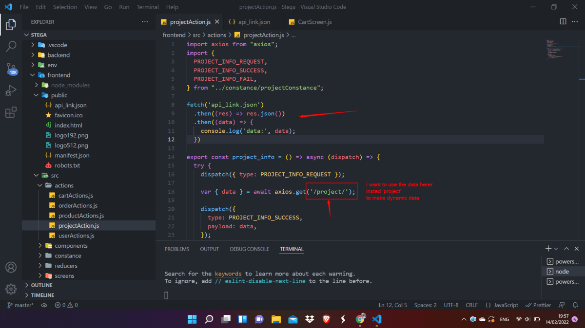 Note that axios and fetch are two APIs for doing the same job. It doesn’t really make sense to mix them.