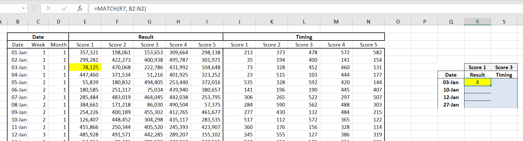 E.g., I want the two cells in yellow to be the same. For this, I need to find the columns Score 1 and Result, and then find the row 03-Jan so that I get the actual score. Do you have any idea how to solve this? I tried with some match and index but I do not get the solution.