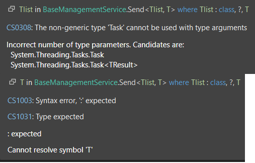 protected async Task<(TList, T)> Send<TList,T>(string aParam,string bParam, string cParam) where TList : IEnumerable<T> where T : struct