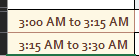 =TEXT(TIME(3,0+(ROW()-1)*15,0), "H:MM AM/PM") & " to " & TEXT(TIME(3,15+(ROW()-1)*15,0), "H:MM AM/PM")