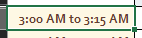 =TEXT(TIME(3,0,0), "H:MM AM/PM") & " to " & TEXT(TIME(3,15,0), "H:MM AM/PM")