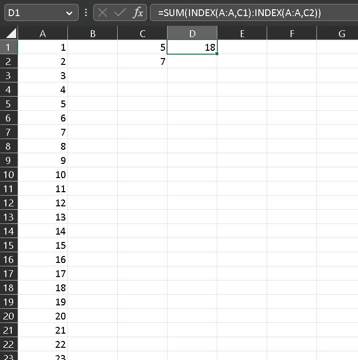 =SUM(INDEX(B:B,A1):INDEX(B:B,A2))