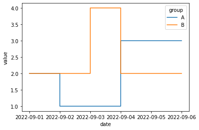 x='date', y='value', hue='group', drawstyle='steps-post')