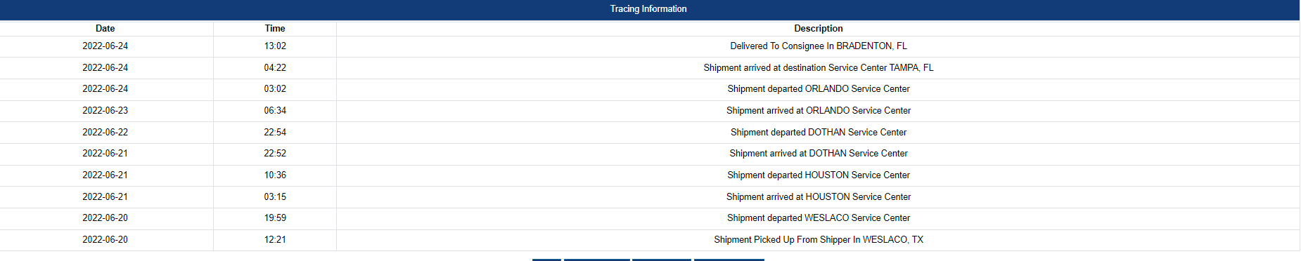 # 2 2022-06-24 04:22 Shipment arrived at destination Service Center TAMPA, FL