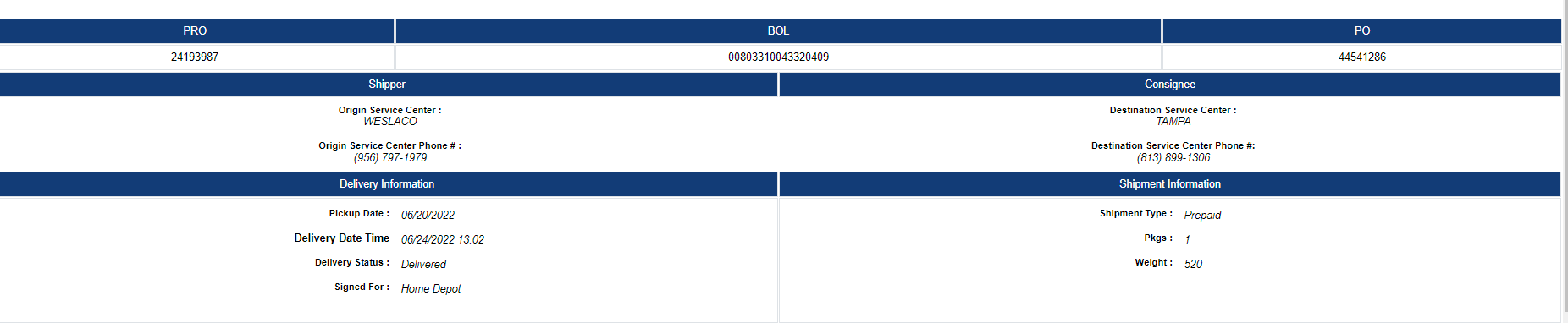 # 1 2022-06-24 13:02 Delivered To Consignee In BRADENTON, FL