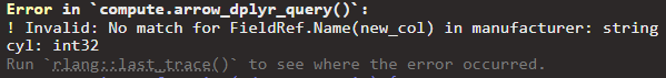 I’m attempting to write a function that uses dplyr verbs and that takes an "arrow open dataset" as the first argument, and a column in that dataset as the second argument. Since I would like to pass the column as a string (necessary for the context of my actual task I’m working on, i.e. Shiny), I’m using the syntax .data[[.column]]. Below is an image of the error I’m getting and some code to reproduce said error. Any help or insight is appreciated.