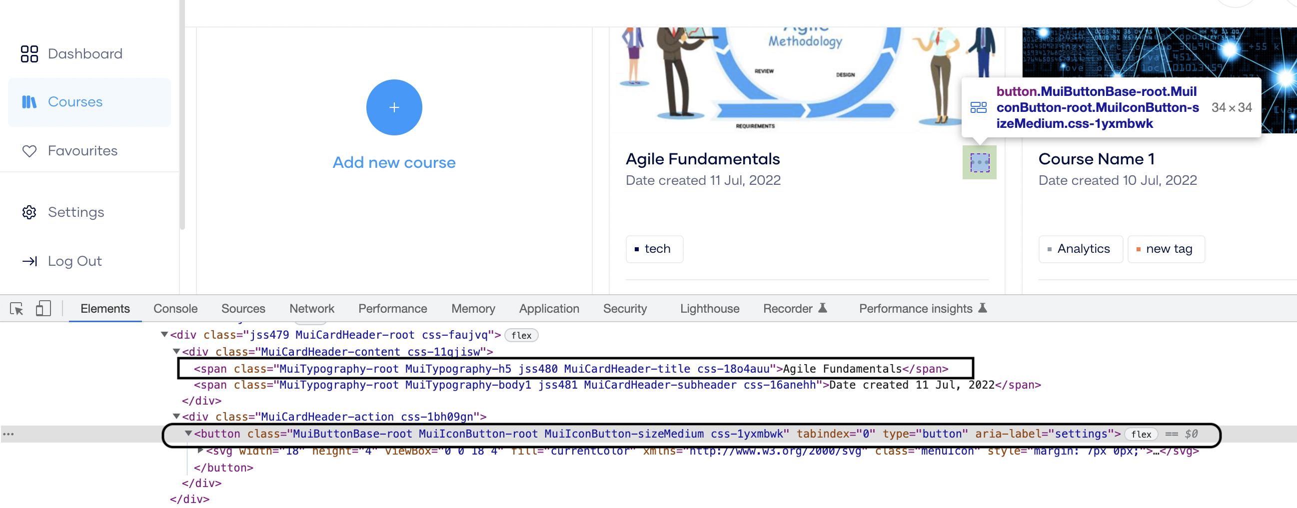 cy.contains(‘span’, ‘Agile Fundamentals’).next().find(‘button’).click()