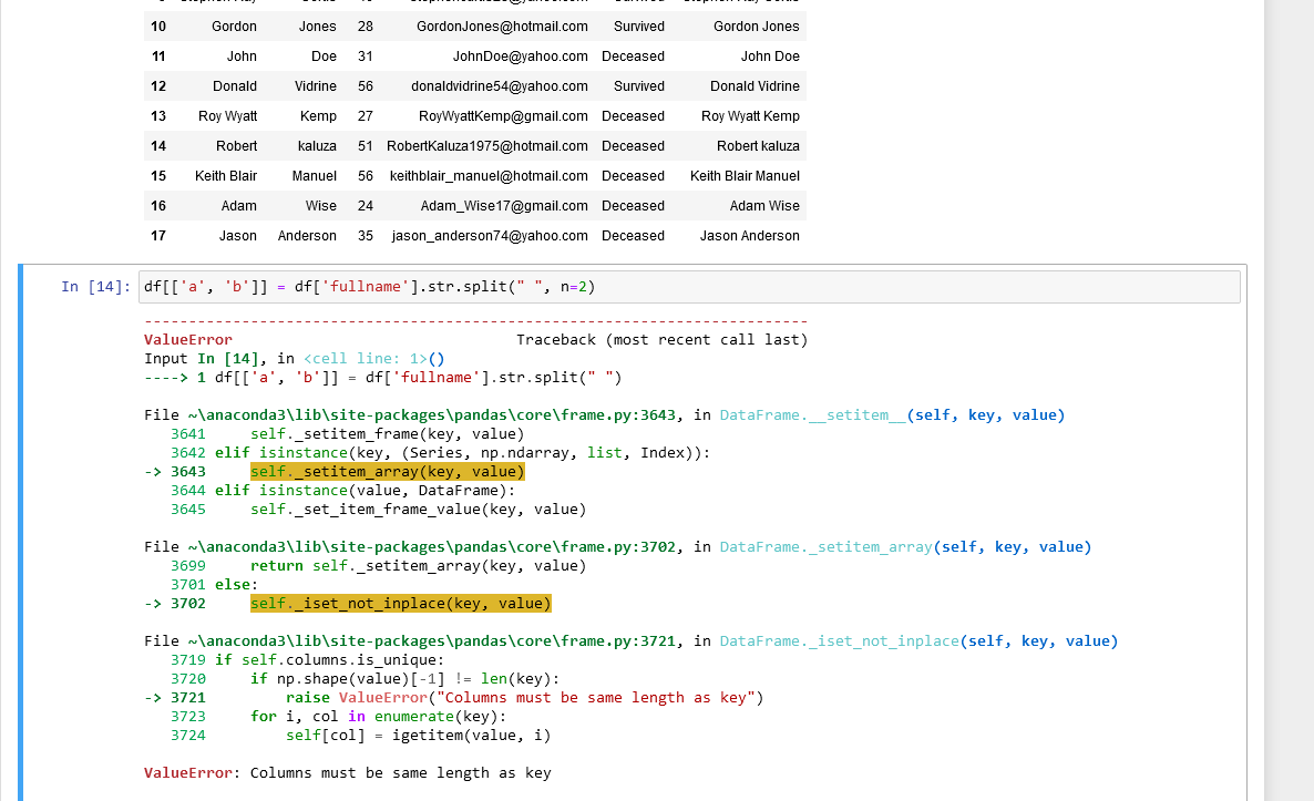 I tried to concatenate the two columns firstname and lastname into one columns. Now, how about to split it into two columns when his/her firstname consisting of 2, 3 and more words from his/her lastname? Is there any easy way to do it? I tried using str.split() methods. But it says "columns should be the same length."