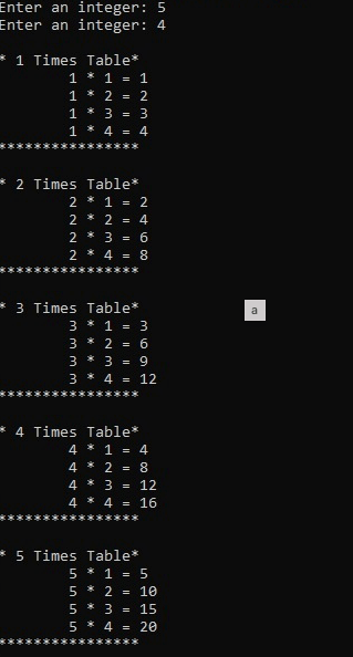 Im very new to C, The programs primary function is to print multiplication tables up to the users specified integers. But the main thing that Im missing is being able to print the designated times table for which is being printed. For example this is the 1’s time table this is the 2’s time table etc. Thanks for your Help.