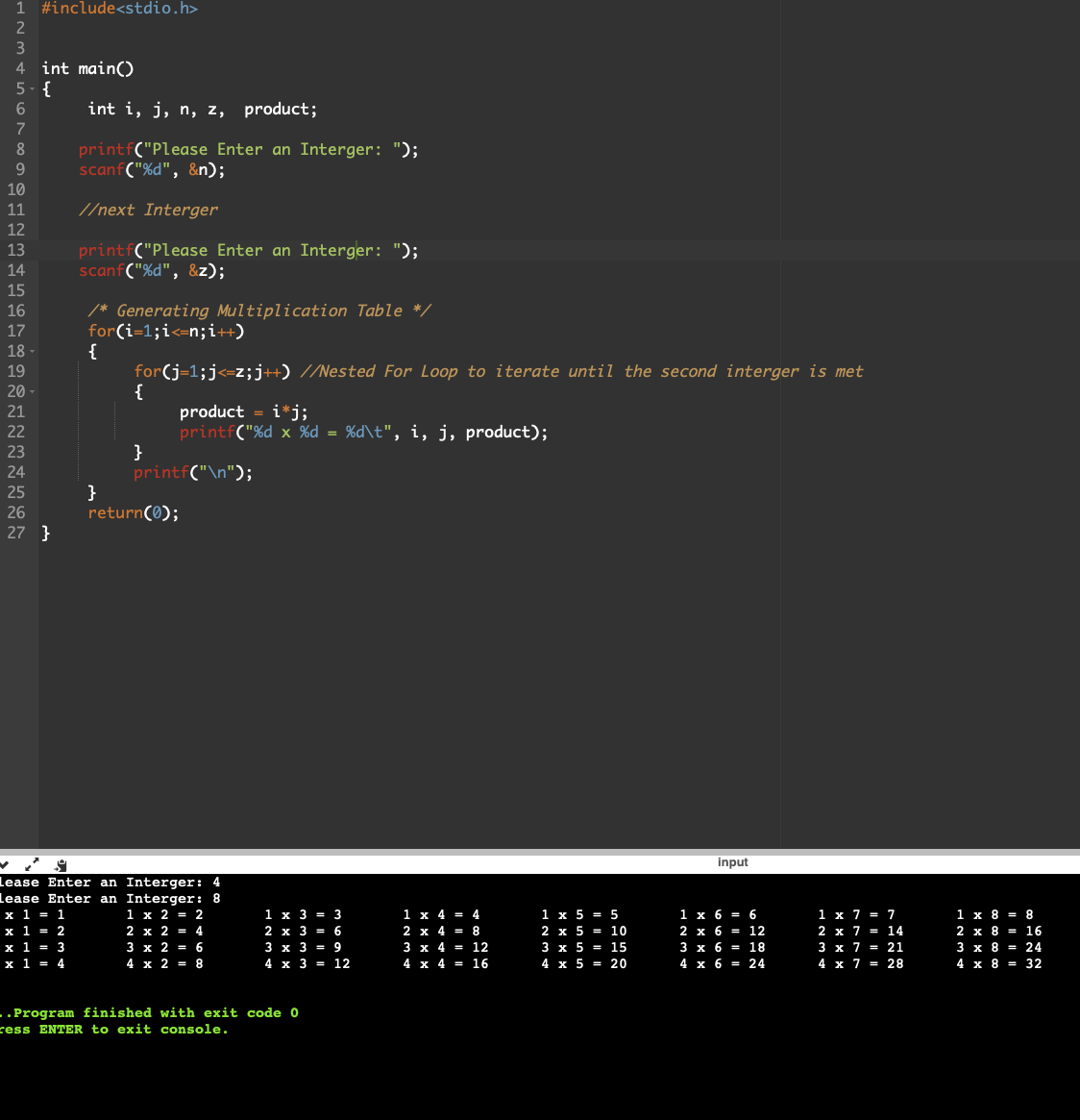 for(j=1;j<=z;j++) //Nested For Loop to iterate until the second interger is met