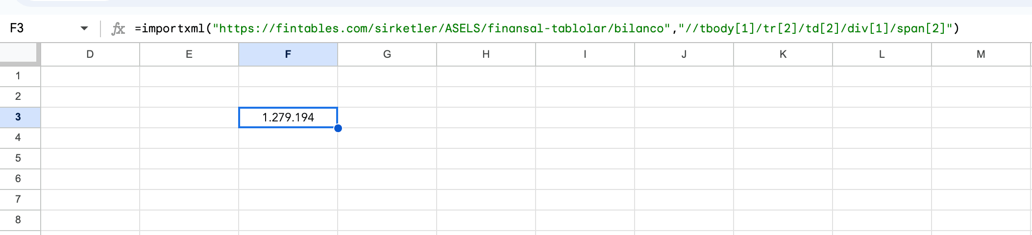 =importxml("https://fintables.com/sirketler/ASELS/finansal-tablolar/bilanco";"//tbody[1]/tr[2]/td[2]/div[1]/span[2]")