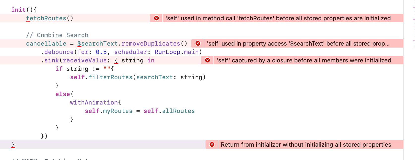 Some of your properties — dateBringDate and locationPlaceLogLat — do not have default values and are thus uninitialized by the time you call fetchRoutes in the init method. To fix, you should initialize them at the start of init or provide default values: