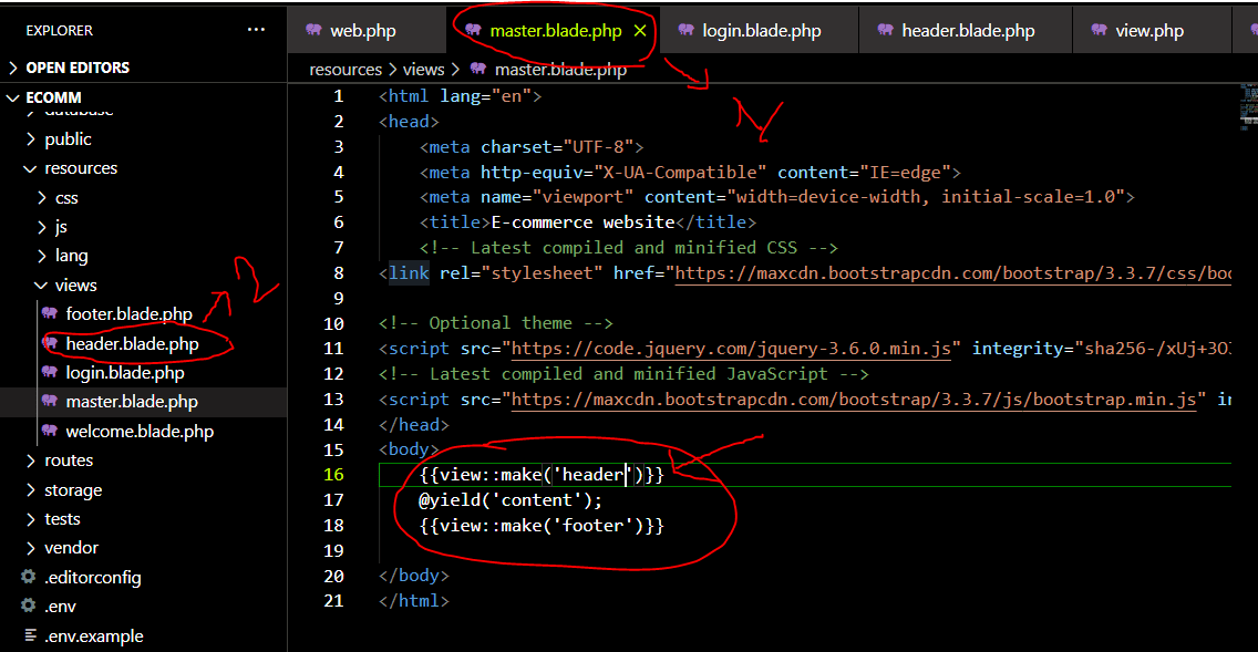 Inside first picture, the page name master.blade.php. Where I want to insert header.blade.php coding {{view::make(‘header’)}}.