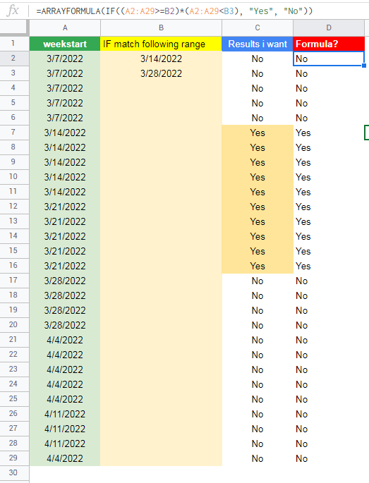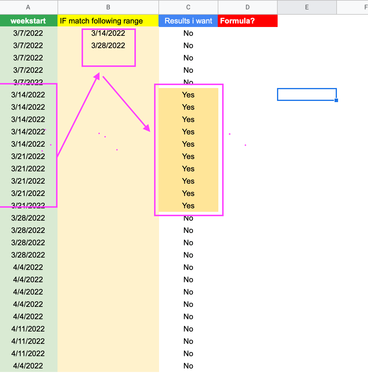 How should I draft my IF Statement here if I am looking to label "Yes" and "No" if it match the date in Column B. Here is the trix