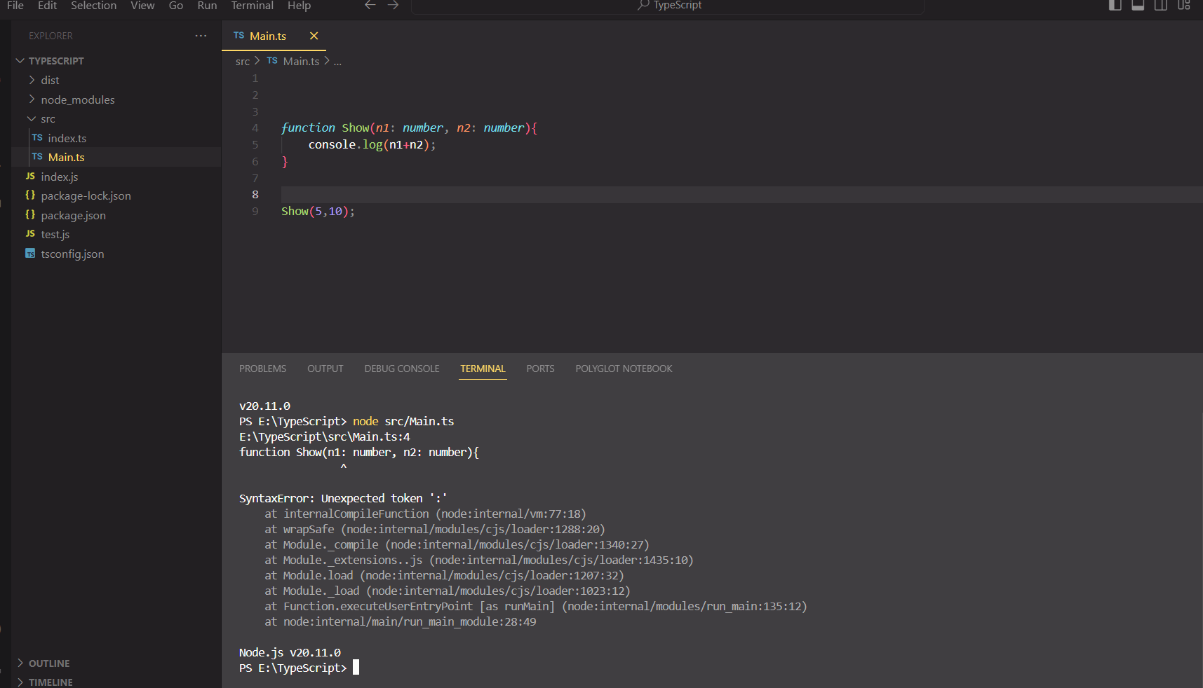 Im creating a simple function in type script but when i try to run the code in vsc it throws me with this error SyntaxError: Unexpected token ‘:’ why ?
