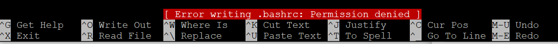 You’re trying to create a new file in the root directory /, where a normal user doesn’t have permission to write. The file you must edit is located in your home directory, so open the editor this way: nano ~/.bashrc