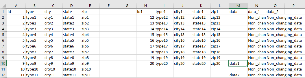 I have an excel file named "inner_merge" which in first sheet named "original" contains 2 separated dataframes exactly like in the image below. The first one has columns id,type,state,zip and the second id1,type1,city1,state1,zip1,data,data_1,data_2 I would like to know how could I import those two in Rstudio as separated dataframes, avoiding to create two separated excel files.