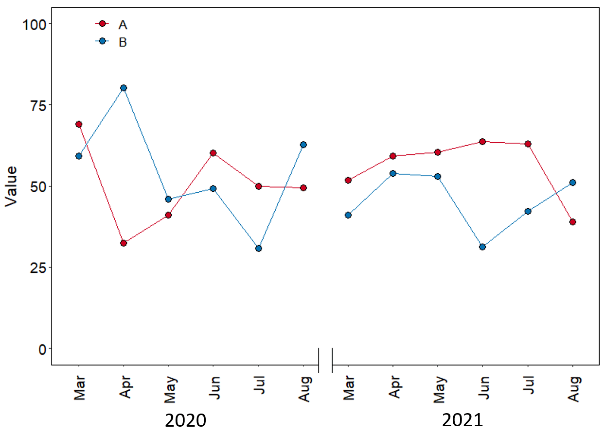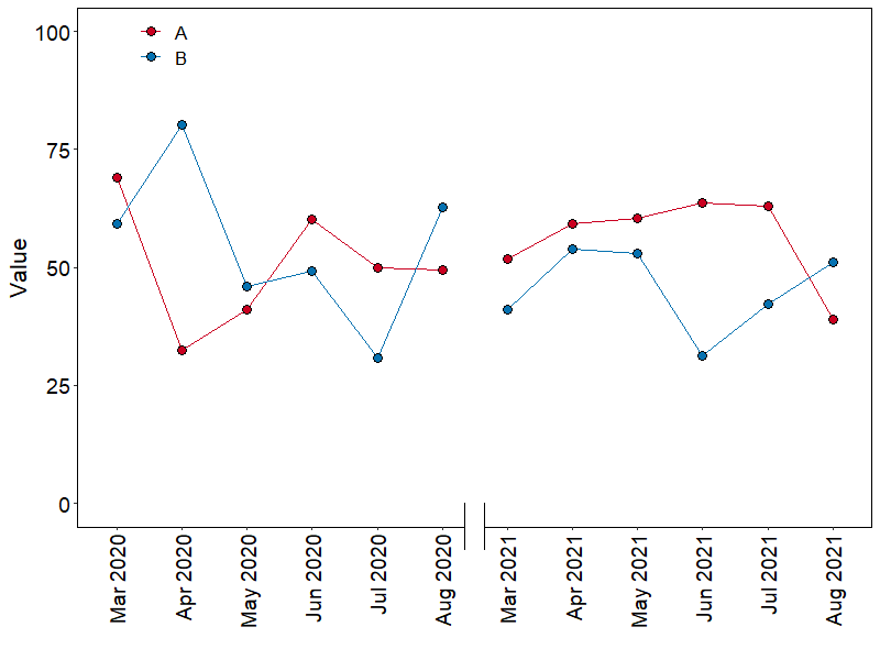 df2$Date <- rep(seq.Date(as.Date("2021-03-14"),as.Date("2021-08-20"),"1 month"),2)