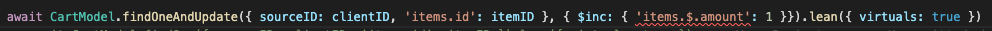 const item = await CartModel.findOneAndUpdate({ sourceID: clientID, 'items.id': itemID }, { $inc: { 'items.$.amount': 1 }}).lean({ virtuals: true })