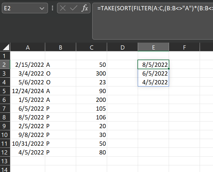 =TAKE(SORT(FILTER(A:C,(B:B<>"A")*(B:B<>"O")),3,-1),3,1)