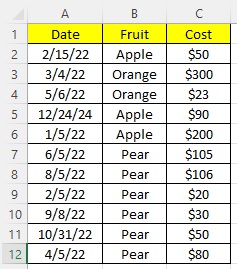 Trying to derive the top 3 highest cost fruits and return the date they were bought excluding apples and oranges. I would like to avoid using a helper column. Having issues w/ these formulas. Not sure if you can have an array (Large w/ IFS) inside of another formula. The formulas I have so far: