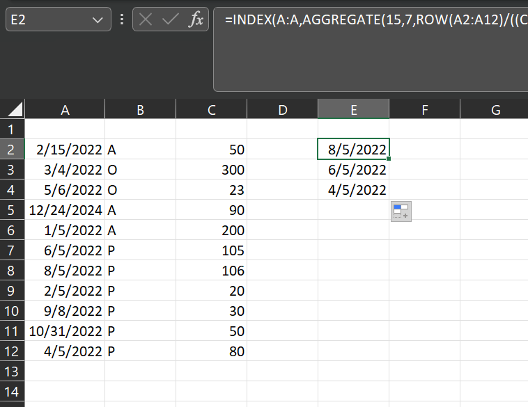 =INDEX(A:A,AGGREGATE(15,7,ROW(A2:A12)/((C2:C12=AGGREGATE(14,7,C2:C12/((B2:B12<>"A")*(B2:B12<>"O")),ROW($ZZ1)))*(B2:B12<>"A")*(B2:B12<>"O")),1))