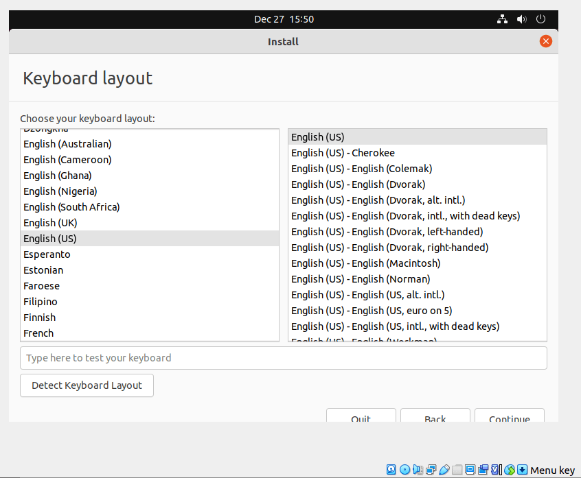 When I choose English as installation language, the keyboard selection screen looks like this: