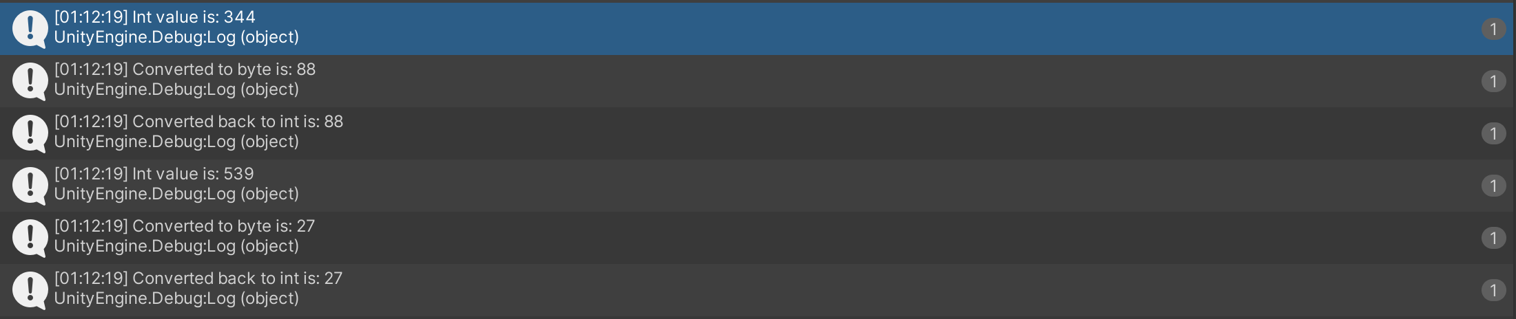 Debug.Log("Converted to byte is: " + b.ToString());