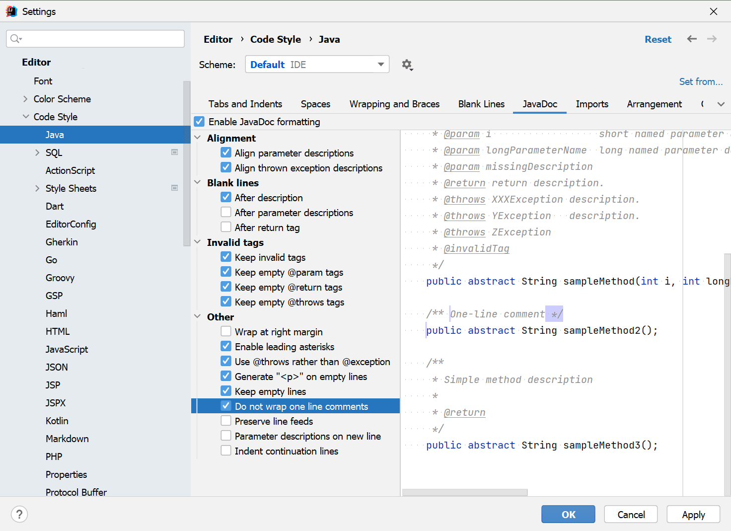 Settings (Preferences on macOS) | Editor | Code Style | Java | JavaDoc | Other | Do not wrap one line comments.