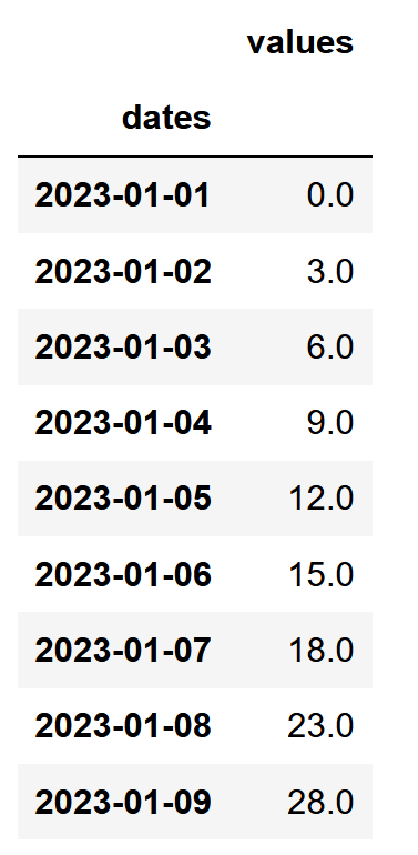 frame1=pd.DataFrame({'dates':['2023-01-01','2023-01-07','2023-01-09'],'values':[0,18,28]})