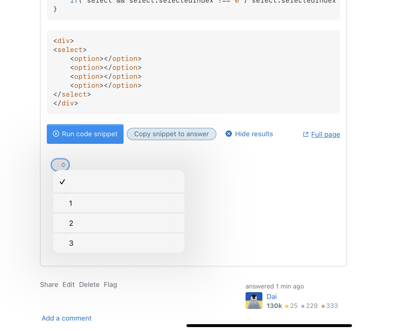 .selected = falseon everyHTMLOptionElementunless its owner<select>has<select multiple="multiple">(which you don’t), so just setoptions[i].closest('select').selectedIndex = 0;to reset selection to the first<option>.
