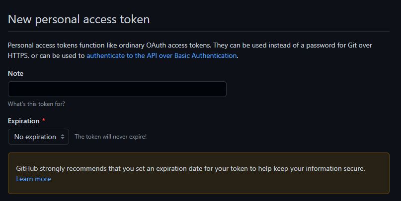 When you’re generating a new token access, Github allows you to choose the option of ‘No expiration’, but as said in the docs, GitHub strongly recommends that you set an expiration date for your token to help keep your information secure.