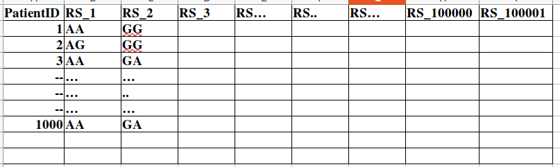 If you want to use a relational database. You should create a table for just patients and a separate table that has a foreign key pointing to the user and another column for the genetic variation. Instead of having a column per RS_***, those should be a row. So for example User A will have 100,000 rows in Table B each row being RS_{insert_index}.