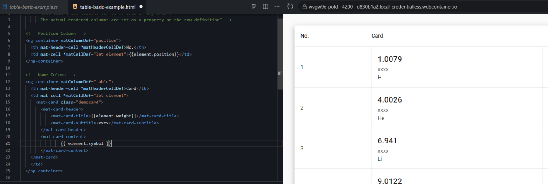 Is it possible to use mat-card instead of mat-table. Here is an example which is of course not working. But this is just an example in which direction I would like to go and display the data.