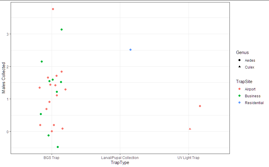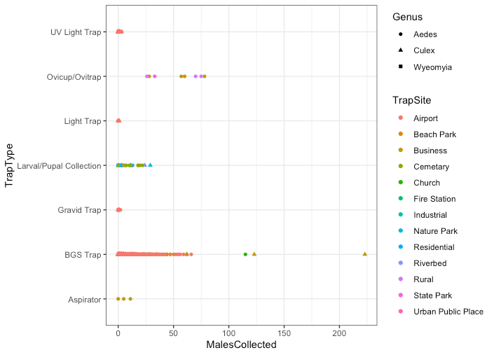 geom_point(aes(color=TrapSite, shape=Genus)) +theme_bw()