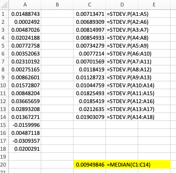 In cells C1:C14, I calculate the standard devation of subarrays in A1:A18 of length 5. This is the intermediate step.