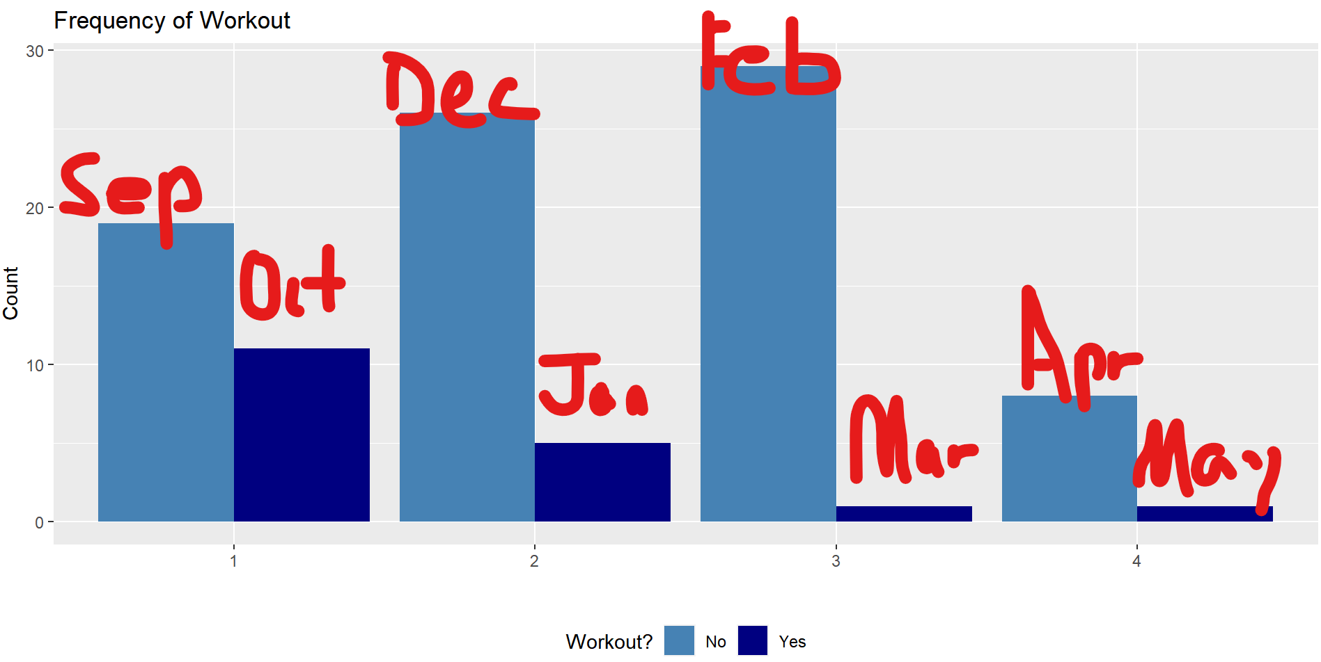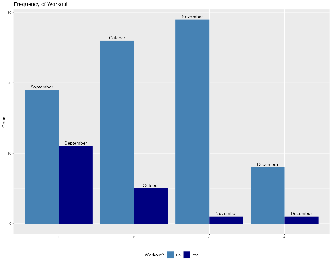 I am trying to create a bar graph that includes an identifier for which month of the year workouts were done more consistently, and labeling the tops of the bars with a label of the specific month. So far I have this: