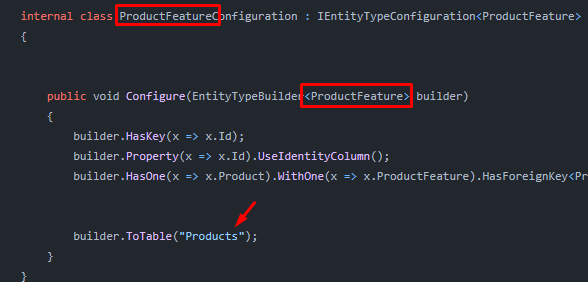 Cannot use table ‘Products’ for entity type ‘ProductFeature’ since it is being used for entity type ‘Product’ and potentially other entity types, but there is no linking relationship. Add a foreign key to ‘ProductFeature’ on the primary key properties and pointing to the primary key on another entity type mapped to ‘Products’.