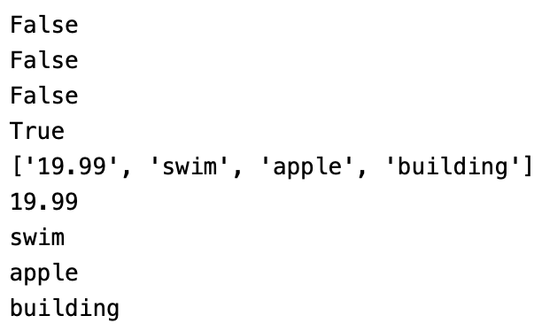 x = ["678", "19.99", "132.1", "swim", "40203", "apple", "building"]